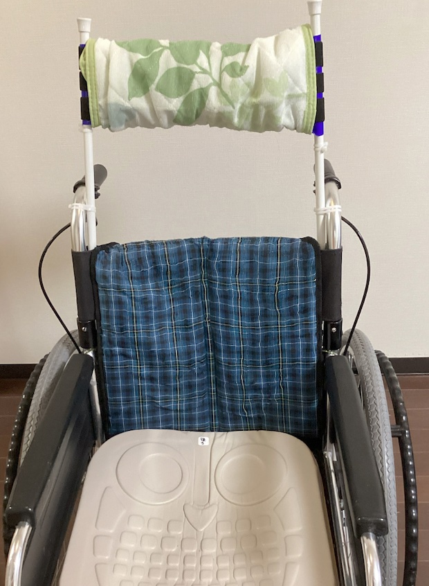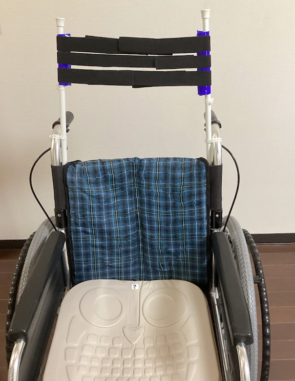 (頭部後屈が著明であれば、支持性を高めるために伸縮ベルトの本数を増やします)